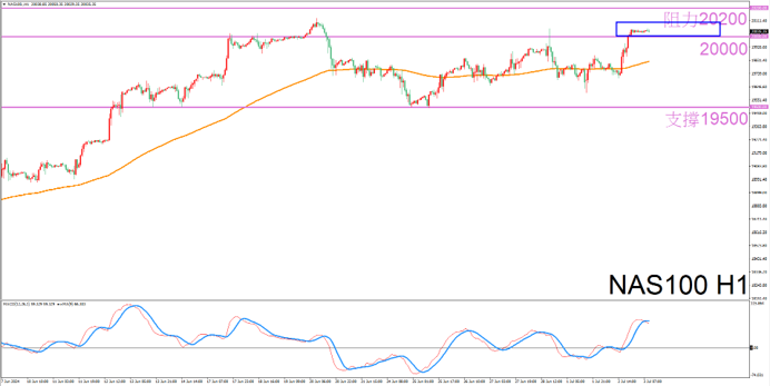 纳指今日晚间因独立纪念日将提前休市,预计在昨日站上的20000关口小幅排徊,短线没有好的进场机会,操作暂时可以保守一些,先观察目前的走势是否有要回调的迹象。