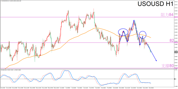 美油价昨日晚间的反弹幅度比预期中小,连上周的左肩位置都没触及,今日日间跌破盘整区间,短线上空方力量比较强劲,不过考虑到整体还是横盘走势,第一个部分先注意上周的低点位置81美元/桶,跌破可以追空至支撑位。