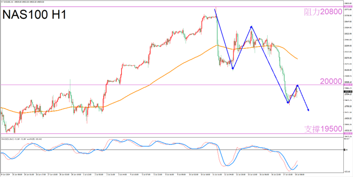 纳指昨日晚间大跌了一波,跌破20000这个重要关口,获利了结及资金转向其他版块的迹象明显,加上芯片禁令的利空消息影响,短线的回调可能会进一步扩大,操作上可以转为短空进场。