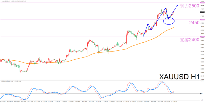 金价昨日晚间下跌测试了顶底转换位2450美元/盎司一线,成功在此获得支撑后,今日有继续上涨的迹象,晚间操作延续昨日的思路,不跌破2450美元/盎司都以多单进场。