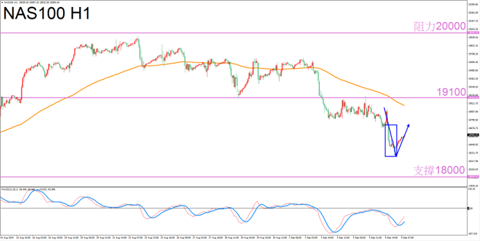 纳指上周五晚间继续回调走势,盘中低点创下一周新低,本周开盘后有一波反弹出现,晚间预计有机会上涨至被跌破的低点,不过距离有点近,操作上若保守一些则等高空机会即可。