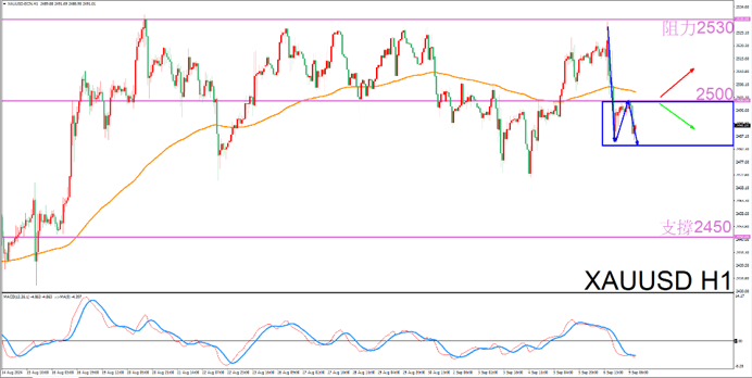 金价上周五晚间从高位一路回落,今日开盘后反弹测试2500美元/盎司,突破无果整体还是震荡偏空走势,今日晚间操作上维持空方思路,以2500美元/盎司做为多空分界线。