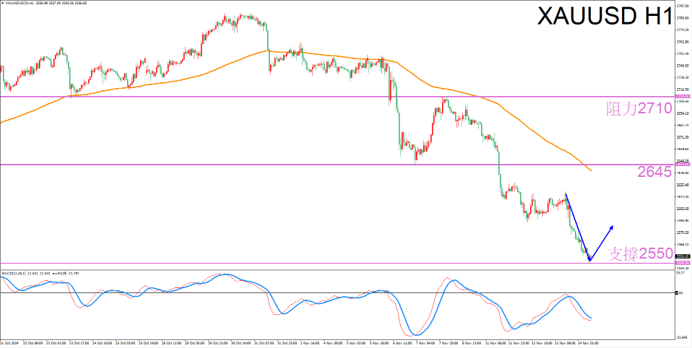 金价昨日晚间一路下挫,目前已经跌至原先预期的支撑位2550美元/盎司,晚间操作上预期在此处会有反弹发生,上方可以先看到周二的低点一线,需注意的是,操作反弹多单可以视情况离场,不一定要拿到目标。