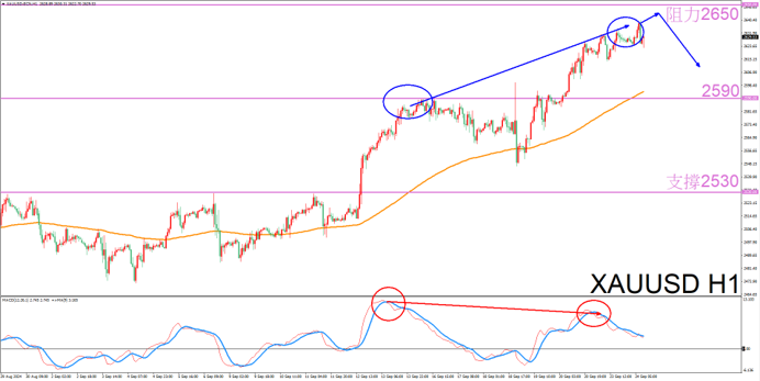 金价昨日晚间缓慢上涨,再度刷新了新高,这波在创下新高后MACD顶背离的状况越发明显,操作上要特别注意后续可能出现的大型回调,2630美元/盎司的阻力被突破后下一个就看2650美元/盎司是否会展现阻力。