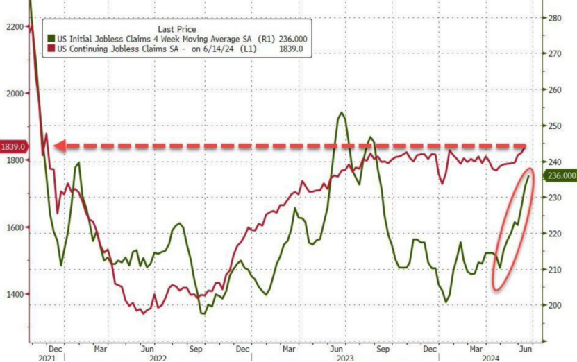 数据显示,美国6月15日当周续请失业救济人数183.9万人,超过预期的182.8万人,前值182.8万人,为2021年底以来的最高水平。这表明,失业者要花更长的时间才能找到工作,对美国经济而言并不是一个积极的信号。