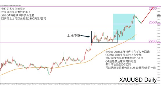 从技术面看,金价在二季度头部未能发挥作用,后续创下新高后成为上涨中继区间,VT Markets认为,作为今年黄金多头二次进攻的起始点,该区间对多头来说是重要的防守区域,不过在多项利多因素的影响下,预计四季度没有机会跌至该区间,操作上仍维持多方思路,第一回调点可以先放在2550美元/盎司,若跌至该区间则可以进场中线多单。