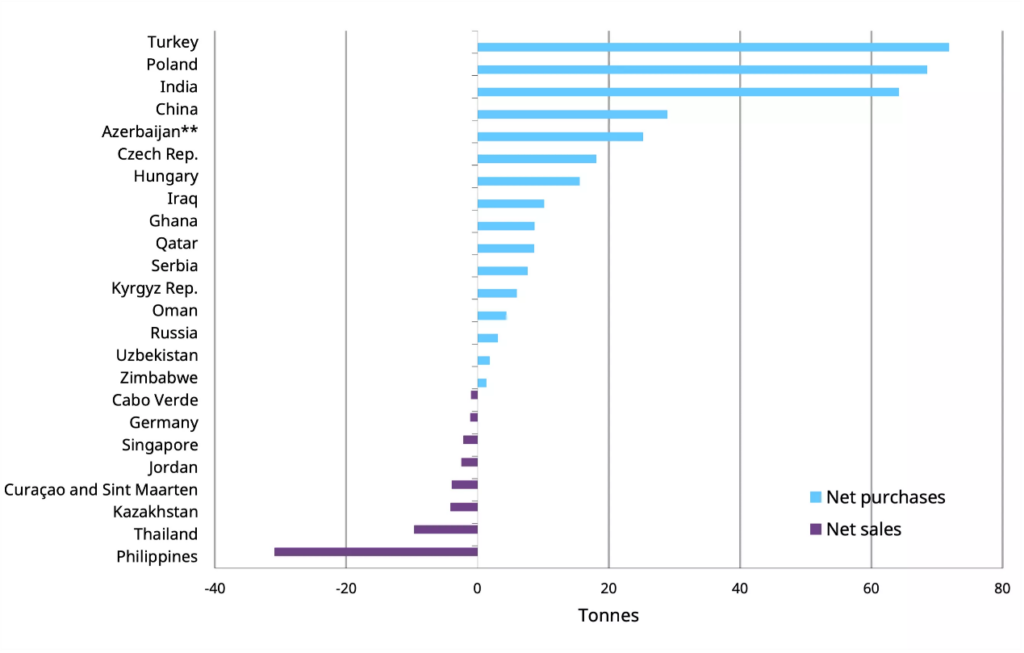 以中国、俄罗斯为首的金砖国家积极推进“去美元化”政策,为黄金价格提供了强有力的支撑。金砖国家的黄金储备增长显着,从2018年的4,360公吨增加至2024年的近5,550公吨。此外,南非、东欧和非洲等新兴国家和地区黄金储备量也大幅飙升,据世界黄金协会(WGC)的统计数据显示,截至2024年10月,土耳其、波兰和印度成为央行黄金净买入量的前三名。黄金因无信用风险特性使其在全球主权债务快速增长的环境中受到青睐,WGC预计,2025年央行对黄金的需求将超过500吨,继续为金价提供积极支撑。